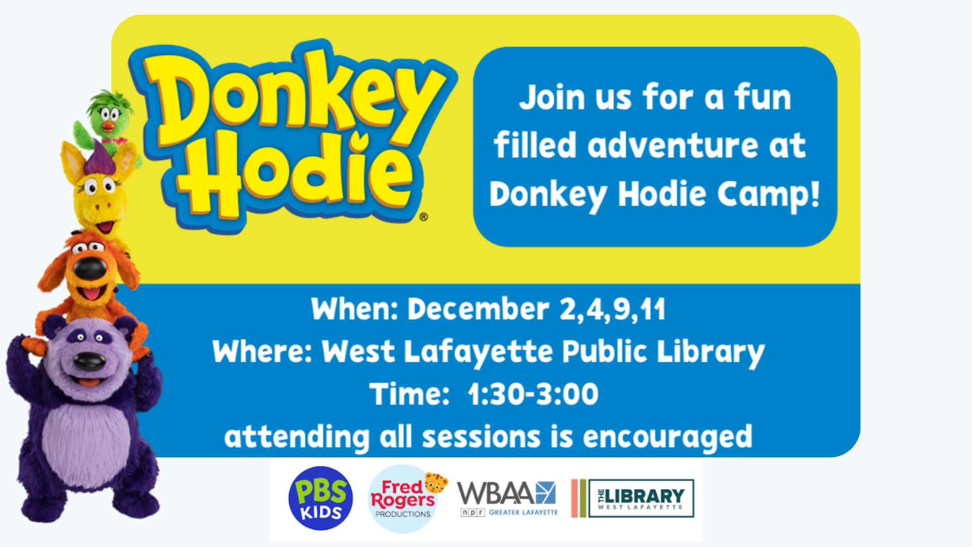 Our friends from WBAA Greater Lafayette bring this excellent opportunity for kids ages 3-5 to attend Donkey Hodie camp! Learn and play with Donkey Hodie during this multi-session camp in the Elm and Maple Rooms. Families will participate in fun and educational activities that will empower children ages 3-6 to dream big and overcome obstacles. […]