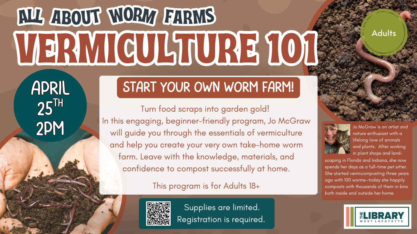 Adult Program: Vermiculture 101 All About Worm Farms Apr 25 Adult Program: Vermiculture 101 All About Worm Farms 2:00 pm - 3:30 pm